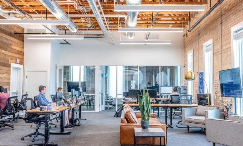 Alt text: Innovative office space highlighting AI deployment, designed for collaboration and efficiency.
